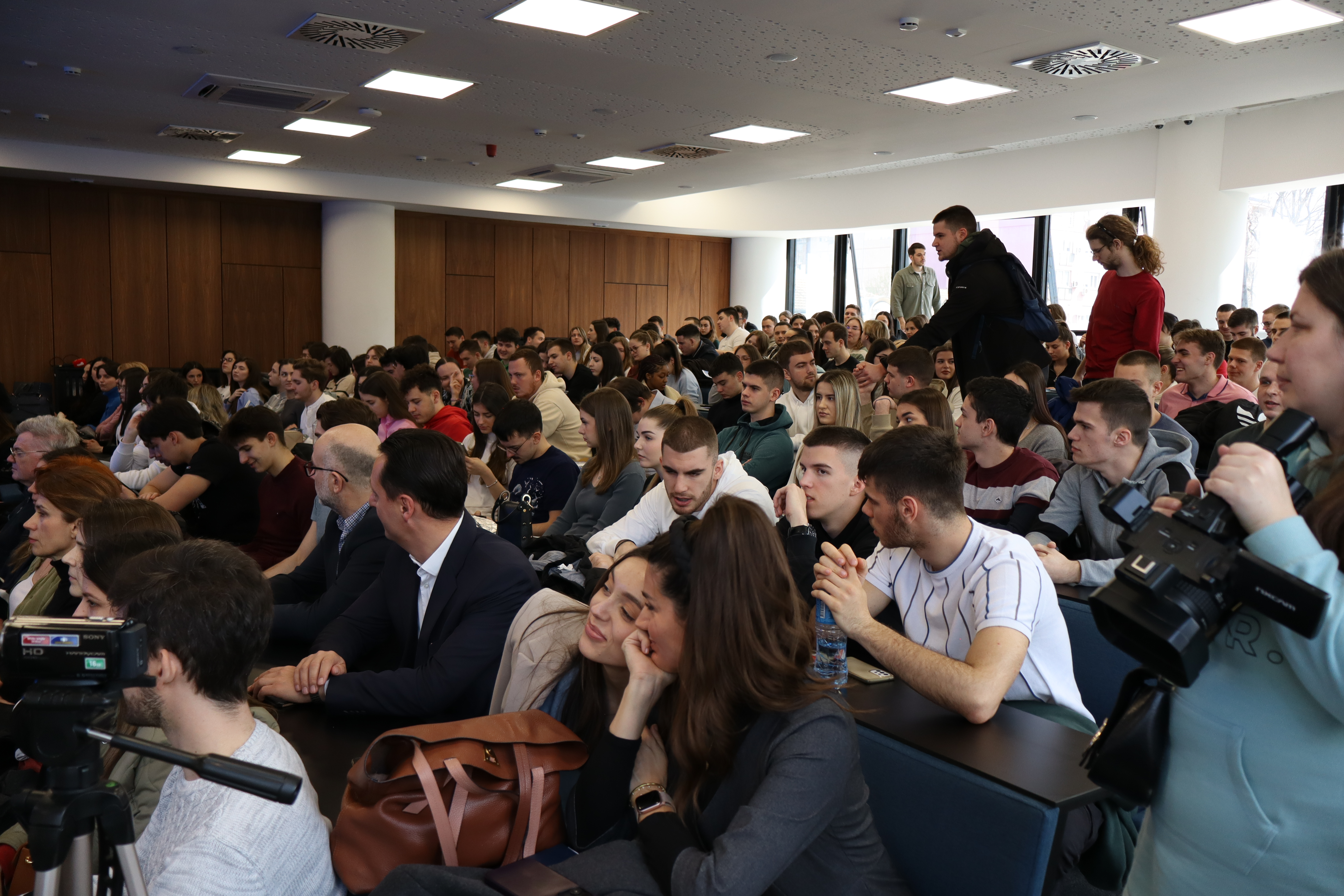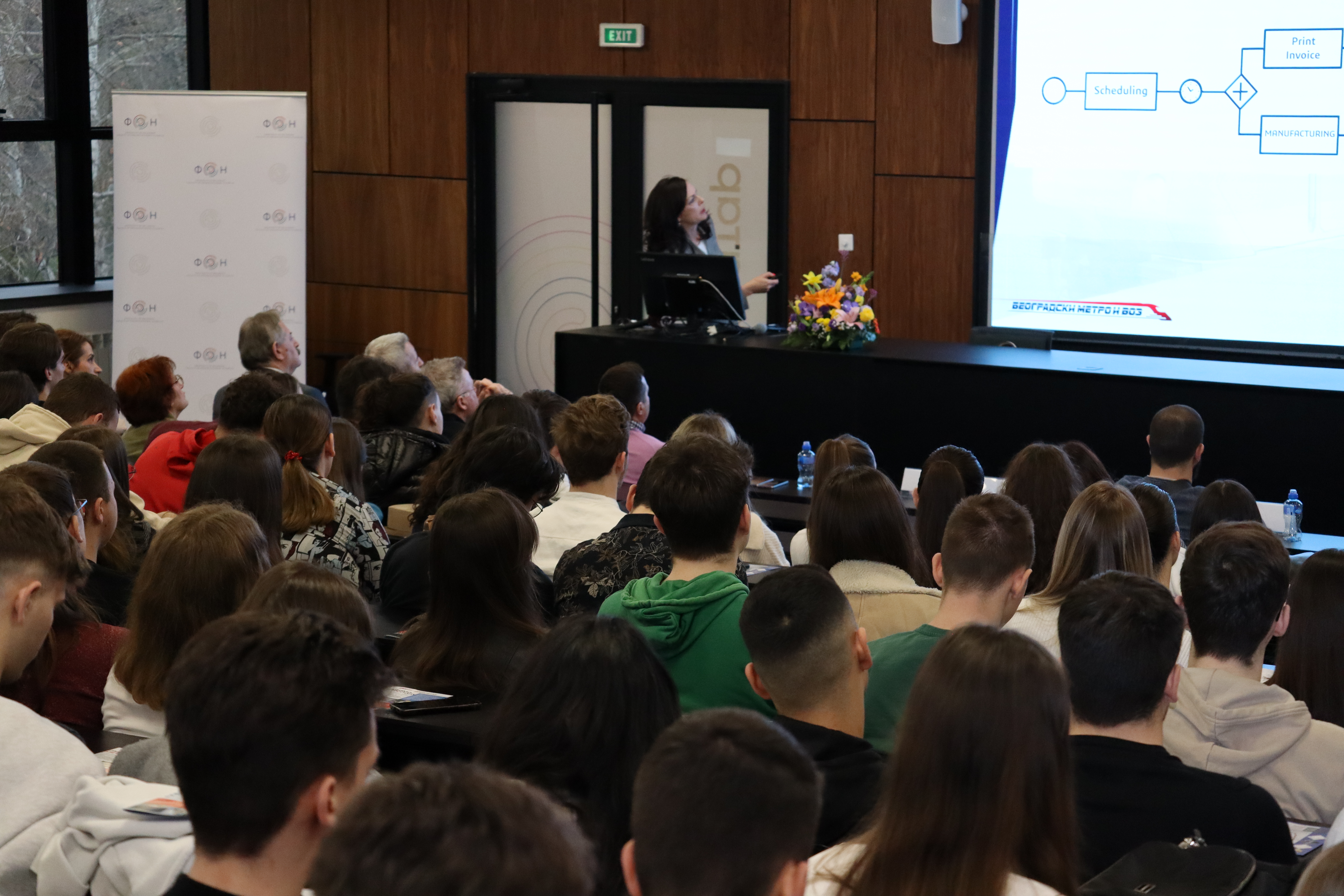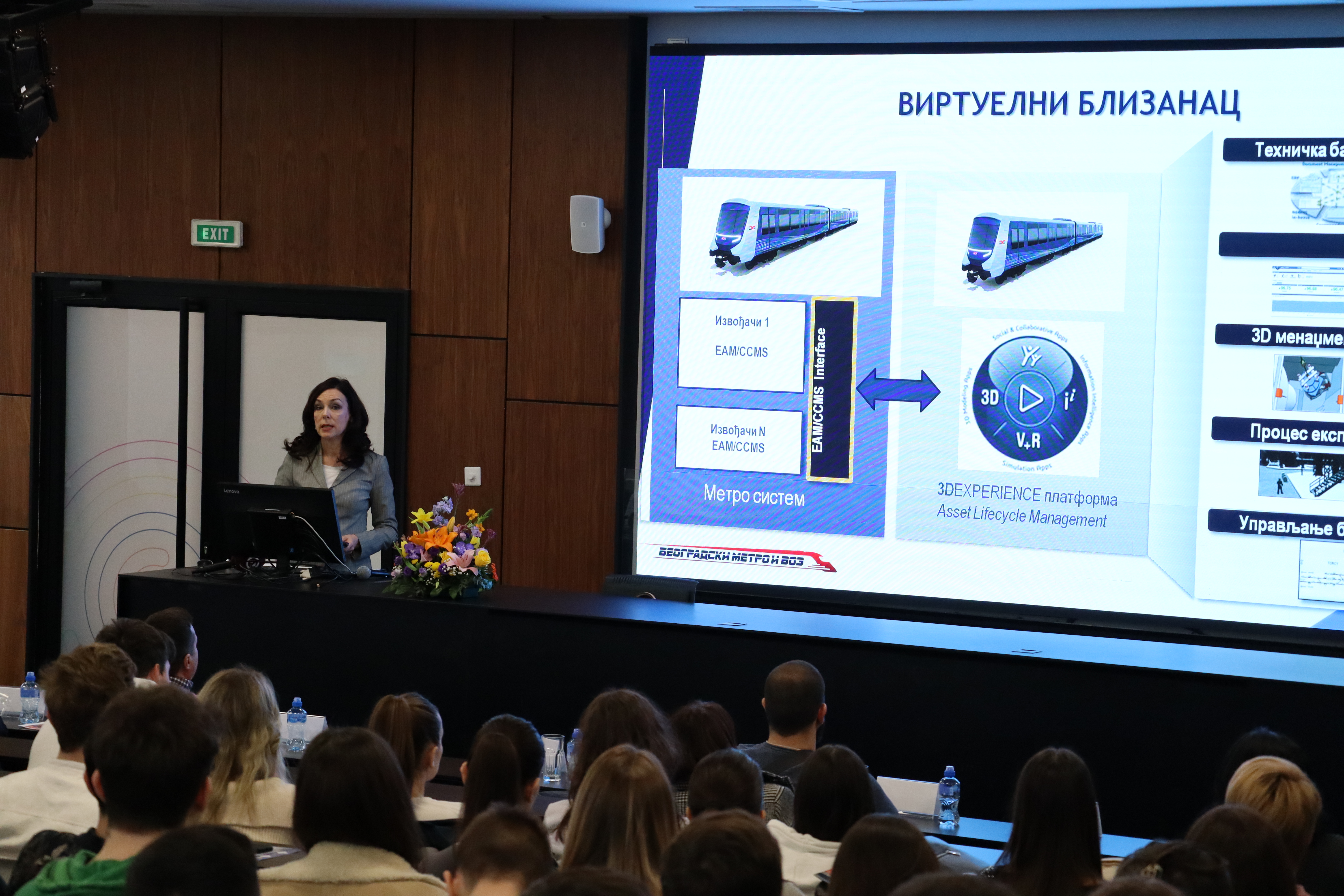 Pred punim amfiteatrom broj pet FON-a Ivanka Rankusović, direktor Sektora za upravljanje informacionim modelom iz JKP „Beogradski metro i voz“ studentima je govorila o razvoju i upotrebi BIM digitalne platforme u svim fazama projekta. „Projekat izgradnje beogradskog metroa je prvi državni infrastrukturni projekat koji se radi po BIM modelu. Složenost izgradnje metro sistema u Beogradu zahteva unapređenje poslovnih procesa i prilagođavanje najsavremenijim IT trendovima i uspostavljanje digitalnog softverskog rešenja. Naše preduzeće ovim, zapravo, ide u korak sa digitalnom transformacijom kroz implementaciju 3DEXPERIENCE rešenja. Osnov je stvaranje kompletnog digitalnog blizanca projekta, a svi podaci će se čuvati u državnom Data centru u Kragujevcu”. I. Rankusović na kraju je istakla mogućnost i potencijal da se FON uključi i u ovaj IT deo poslovnih procesa, kao vrlo perspektivnu i inovativnu granu delatnosti od interesa za fakultet.