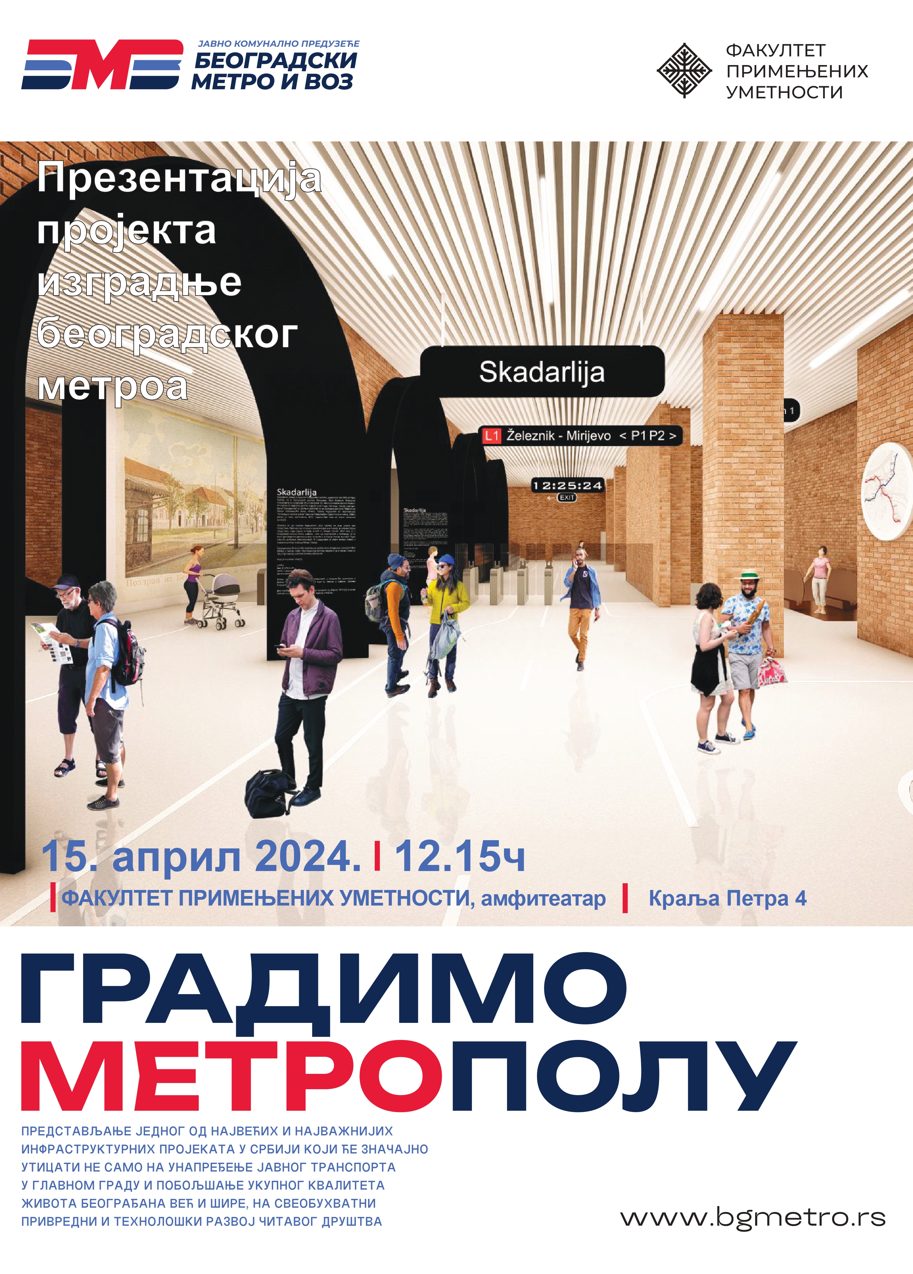 U ponedeljak, 15.4.2024. godine na Fakultetu primenjenih umetnosti biće održana prezentacija projekta izgradnje beogradskog metroa „Gradimo METROpolu“, za studente i stručnu javnost. Događaj će otvoriti dekan FPU Goran Čpajak, nakon čega će direktor JKP “Beogradski metro i voz” Andreja Mladenović predstaviti osnove projekta izgradnje beogradskog metroa.